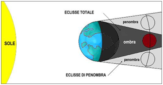 L’eclissi è il parziale o totale occultamento di un corpo celeste da parte di un altro. L’eclissi di Luna si verifica quando il nostro satellite si trova ad attraversare il cono d’ombra causato dalla Terra, che si interpone tra il Sole e la Luna stessa. Un’eclissi di Luna può presentarsi soltanto all’epoca del Plenilunio, cioè quando la Luna si trova in opposizione rispetto al Sole.