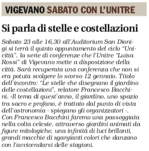 Il tema che unisce questo incontro di conferenze organizzato dall’UNI3, Università del Tempo libero e Terza Età di Vigevano parla di “il giardino, uno spazio tra sacro e profano” trattato dal punto di vista dell’astronomia.